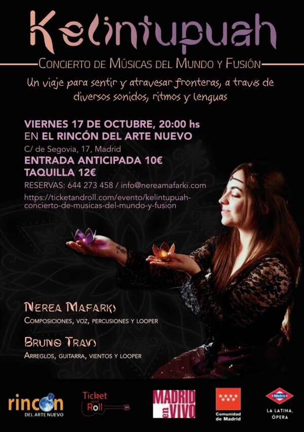 Imagina un espacio donde cada canción no solo se escucha, sino que se vive. Un lugar donde las melodías no solo atraviesan el aire, sino que tocan la esencia misma de lo que somos. En Kelintupuah, cada ritmo te invita a explorar nuevas emociones, a liberarte de lo conocido y a abrazar lo inexplorado. No es solo una oportunidad para disfrutar de la música, sino para reconocer y celebrar lo que nos une como seres humanos. Nerea Mafarki ha trabajado con músicos de países como Senegal, Guinea Bissau, Marruecos, Pakistán, Irán, Perú, Ecuador, Argentina, y muchos más, para crear un sonido que no conoce de fronteras. La música de Nerea es una celebración de la vida, del poder transformador de la música, y de la unidad que surge cuando nos atrevemos a compartir nuestra diversidad.El Poder de la Fusión